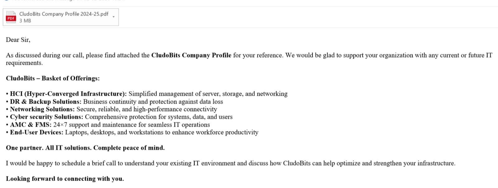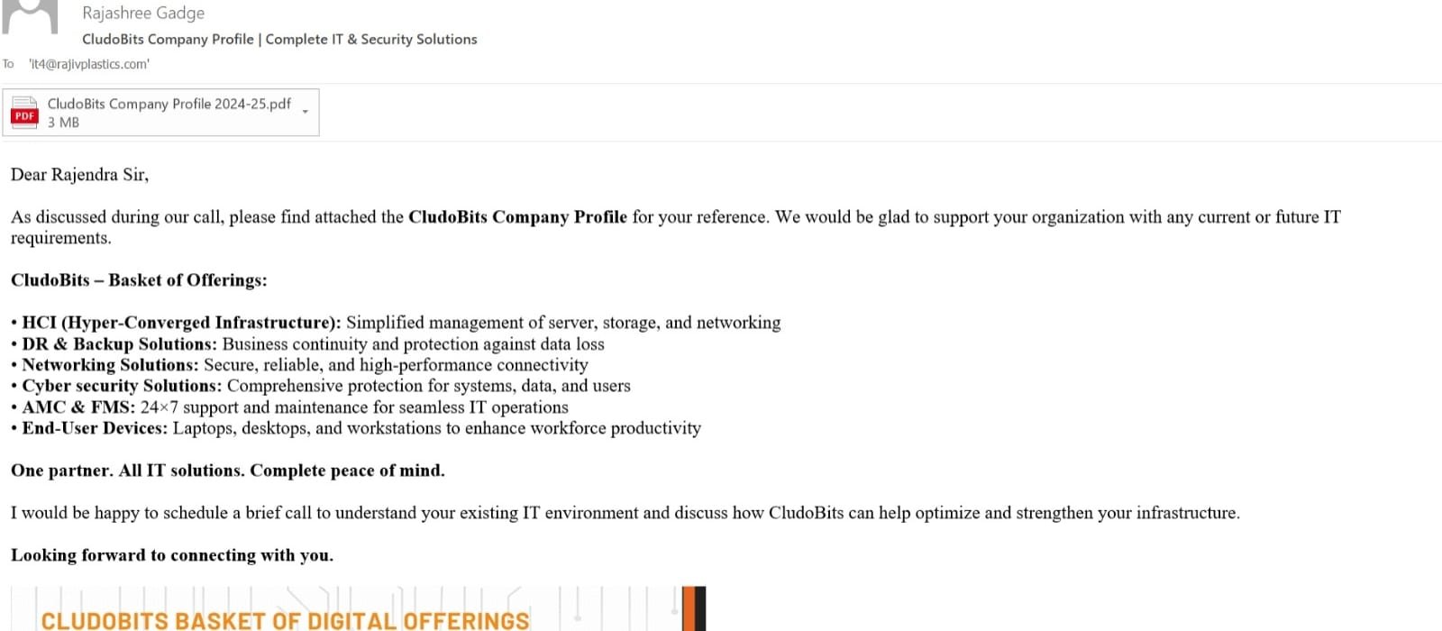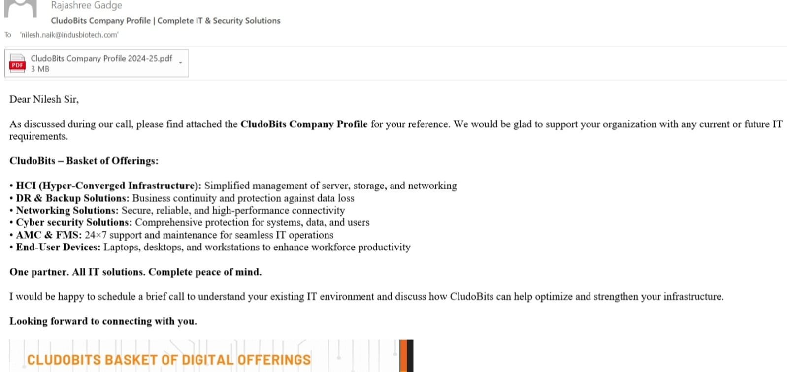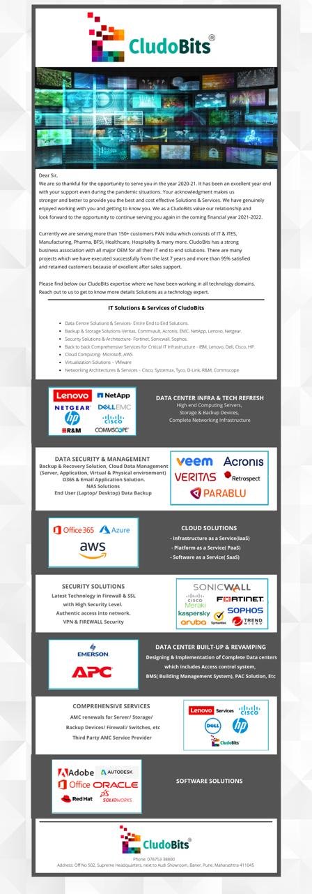 Showcasing CludoBits’ end-to-end IT services, OEM partnerships and infrastructure capabilities for enterprise outreach and sales enablement.