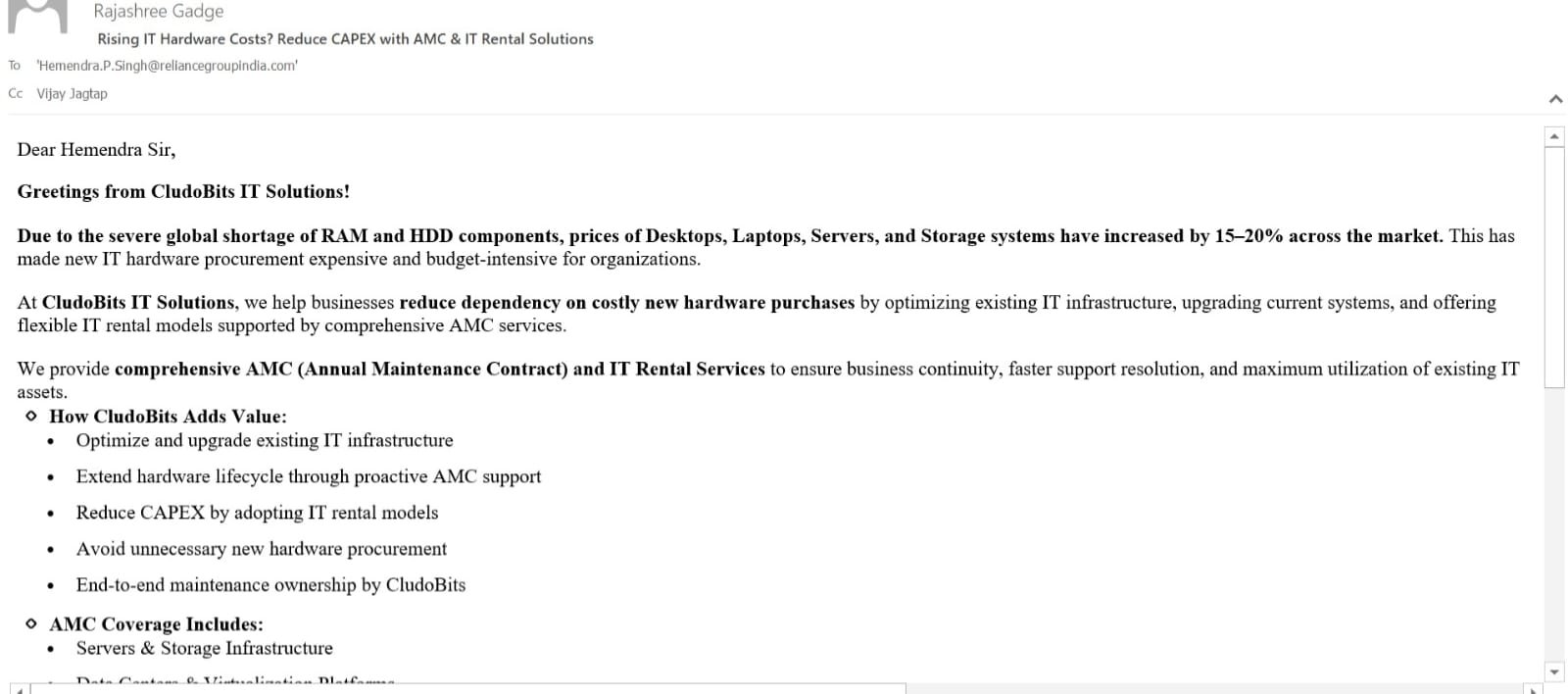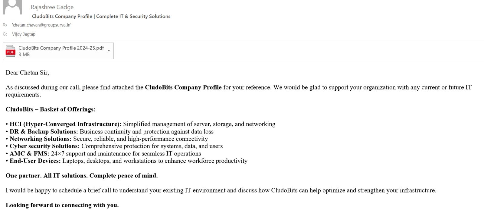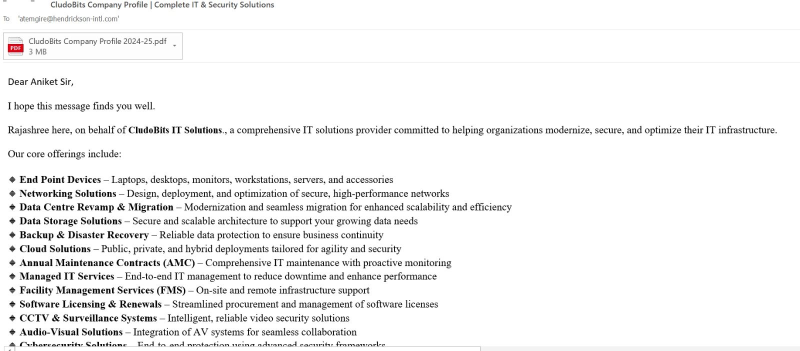 Showcasing CludoBits’ end-to-end IT services, OEM partnerships and infrastructure capabilities for enterprise outreach and sales enablement.